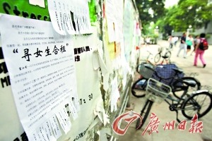 記者在中大校園內(nèi)學五飯?zhí)玫墓鏅谏,貼滿各種各樣的“求租”、“出租”廣告,在該學校附近城中村和小區(qū)街道的墻上則也隨處可見“臨時房屋出租”的廣告,沿主要街道兩側(cè),幾乎每個店鋪門前都立有醒目的臨時房屋出租廣告牌。