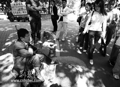 昨日上午10時許,記者趕到華中師范大學(xué),在距離東門不遠(yuǎn)的一處路口,一名男子在地上擺著一張報(bào)紙,上面用黑筆寫著:“××學(xué)院的×××,養(yǎng)父生病,你如此狠心,不管不問……”,吸引了許多學(xué)生圍觀(如圖)。