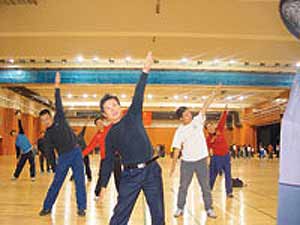 馬步弓身、大鵬展翅、輕邁舞步……如果你認為這是舞蹈比賽或功夫表演,那你就錯了,這是北京中小學體育老師練習新廣播體操的現(xiàn)場。昨天(12日),西城區(qū)400余名中小學體育老師在北京八中參加了第三套廣播體操的集中培訓(xùn)。據(jù)了解,對于西城、海淀等“動手”較早的區(qū)縣,中小學生下月將可“嘗鮮”做起新廣播體操。