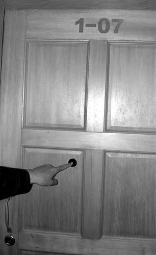 學生們還在上課,女生公寓空無一人,只有生活老師在里面守候,“鐵將軍”把住女生公寓的大門,生活老師打開大門后,記者進入了女生公寓。女生公寓有7層樓高,過道兩旁對應著一間間女生寢室。每間寢室的房門上,果然就有一個圓形小孔。這小孔直徑只有四五厘米,記者將眼睛貼近小孔朝里面一望,寢室里一覽無余。