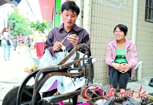 補(bǔ)鞋攤位與房子一街之隔,一張木凳,一臺(tái)機(jī)車,一個(gè)木制工具箱,這就是劉建文的謀生家當(dāng)。如今,年輕的夫婦倆每天坐在街上,妻子幫著拿東西,丈夫忙著修修補(bǔ)補(bǔ),一雙鞋3元錢,一把雨傘2元錢!艾F(xiàn)在干這行的人多了,一天賺個(gè)40元已經(jīng)很不錯(cuò)!苯ㄎ牟粺o(wú)憂慮地表示,“房租230元,兩個(gè)人只有幾百元生活費(fèi),挺難的!