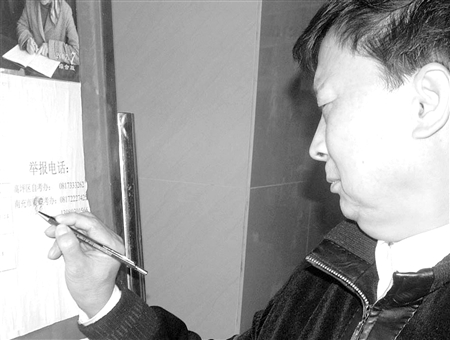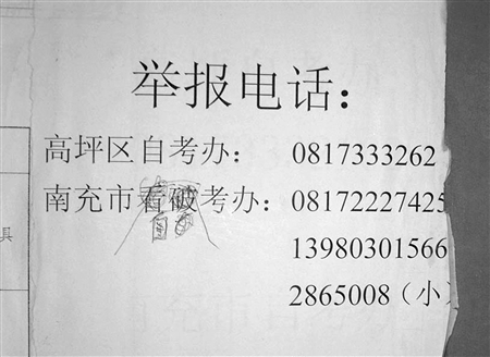在高坪區(qū)教育局辦公大樓一樓大廳右側(cè),擱了一塊公示欄。公示欄中央,寫著“082次自考公示欄、南充市高坪區(qū)高等教育自學(xué)考試委員會(huì)辦公室”等黃底黑色大字。公示欄上面粘貼的內(nèi)容有四川省第082次自學(xué)考試高坪區(qū)高坪中學(xué)考點(diǎn)二區(qū)考點(diǎn)考場安排表等,在公示欄右側(cè)中央,是舉報(bào)電話及單位:舉報(bào)電話:高坪區(qū)自考辦:0817333××××。南充市看破考辦:0817222××××。為了引起考生注意及顯示自考的嚴(yán)肅性,舉報(bào)電話及單位的字體很大,一目了然。