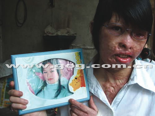 已容顏盡毀的秀娟拿著昔日長發(fā)飄逸、充滿青春活力的照片,噙著淚水向記者訴說了自己的不幸。