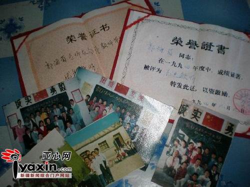 代課教師郭海菊生前獲得的榮譽(yù)證書和她與學(xué)生們的留影