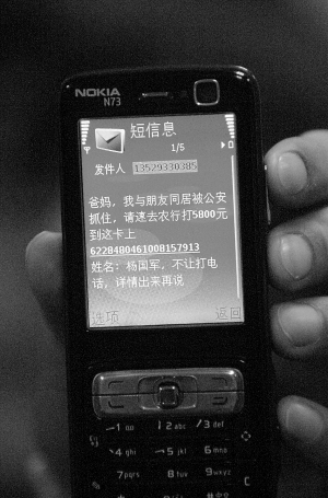 陳女士昨天對記者說,11月29日凌晨4時38分,她收到一條短信,上面寫著:“爸媽,我與朋友同居被公安抓住,請速去農(nóng)行打5800元到這卡上6228480461008157913,姓名:楊國軍,不讓打電話,詳情出來再說!倍l(fā)送人竟然是一個陌生人的號碼:13529330385。陳女士告訴記者,她女兒阿燕(化名)在肇慶某職業(yè)技術(shù)學(xué)院讀大一,由于之前已提前向她提醒說至少有四五名學(xué)生的家長都收到了這條短信,因此她并沒有再理會。