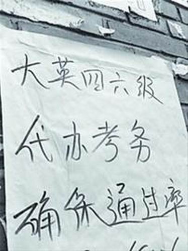 發(fā)表評論  “大學(xué)英語四、六級(jí),代辦考務(wù),保證通過!”“包過,四級(jí)答案,提供隱形耳機(jī)!”最近,類似的小廣告出現(xiàn)在沈陽市個(gè)別大學(xué)的校內(nèi)論壇甚至水房路邊電線桿。