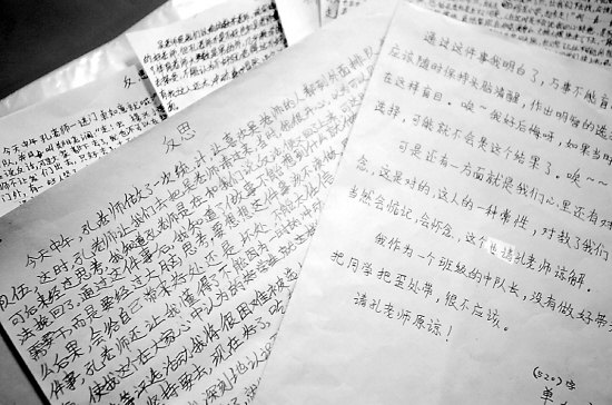 孔老師表示,現(xiàn)在的學生都是溫室里的花朵,稍微批評一下就掉眼淚,必須讓他們經(jīng)歷些挫折,“我是希望通過這件事情讓他們明白,做任何事情都不要沖動,不能盲目跟風,所以才讓學生們寫反思書”。