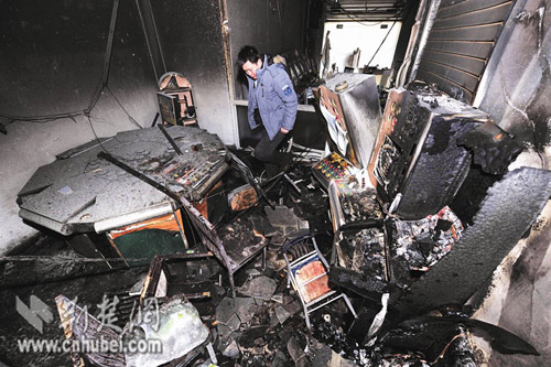 該學(xué)生公寓位于武漢經(jīng)濟技術(shù)開發(fā)區(qū)碧湖新村。昨日上午9時,記者在該公寓42棟宿舍看到,該棟宿舍共有6層,其中1樓為臨街門面。失火的游戲機室位于3單元201宿舍樓下,面積約50平方米,里面有10多臺游戲機,均被燒毀(如圖)。