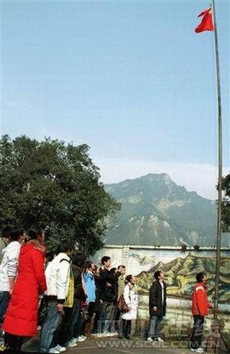 在漢旺東汽中學(xué)操場(chǎng)上,堆滿了一堆廢墟。在學(xué)校圍墻正中央,是一幅2米多寬的萬(wàn)里長(zhǎng)城的國(guó)畫。國(guó)畫前,一面國(guó)旗在風(fēng)中飄揚(yáng)!巴瑢W(xué)們,我們一起在這里,舉行一個(gè)升國(guó)旗儀式,怎么樣?”鄧?yán)蚶蠋煹慕ㄗh很快得到了同學(xué)們的贊同。同學(xué)們不約而同地站在國(guó)旗前,一只手緊貼著胸膛,對(duì)著國(guó)旗行注目禮。這時(shí),黃沛和茍明強(qiáng)兩位同學(xué)站在國(guó)旗下。黃沛雙手輕輕抓住升旗的繩子,茍明強(qiáng)右手抓住國(guó)旗的右上角,順風(fēng)放手。11:08,在丁楠杰的領(lǐng)唱下,同學(xué)們像往常一樣,站在旗桿下,用哽咽的聲音斷斷續(xù)續(xù)地唱著國(guó)歌,看著國(guó)旗緩緩升向天空,許多同學(xué)激動(dòng)得一時(shí)很難再往下唱。