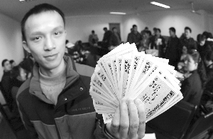 記者在現(xiàn)場注意到,部分學生代表拿到同學們預訂的火車票后仍愁眉不展。環(huán)境學院07級碩士研究生石昕就拿著一疊票在登記表上核對、打鉤,不時嘆息。他們班26人訂票,只拿到了14張票,其余都沒有!安皇菦]票,是有票他們不要!笔空f,沒訂到票的同學多半是往重慶、哈爾濱等方向的,都是要求太高,指定要硬臥,坐票都不考慮。這讓火車站工作人員為了難,這些地區(qū)火車票本身就很緊,臥鋪票更加有限,非臥鋪不要的要求根本無法滿足。