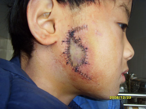 1月5日,記者在鎮(zhèn)平縣公療醫(yī)院看到,已住院17天的鄭超群依然躺在病床上,他的父親鄭榮發(fā)在一邊抹著眼淚。記者看到鄭超群右臉上縫合上的臉皮呈葫蘆型,面積有雞蛋大小,傷口四周是密密麻麻的針線。