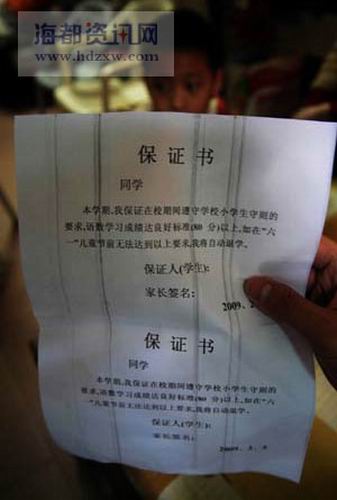 昨日下午5時(shí),記者在石獅市區(qū)找到小強(qiáng)的家人,小強(qiáng)的爸爸王先生(化名)告訴記者,小強(qiáng)今年11歲,在石獅塔前小學(xué)四年級(jí)1班就讀。說(shuō)著,王先生拿出校方的保證書(shū),上面寫(xiě)著“本學(xué)期,我保證在校期間遵守學(xué)校小學(xué)生守則的要求,語(yǔ)數(shù)學(xué)習(xí)成績(jī)達(dá)良好標(biāo)準(zhǔn)(80分)以上,如在六一兒童節(jié)前無(wú)法達(dá)到以上要求,我將自動(dòng)退學(xué)”,后面還有保證人(學(xué)生)和家長(zhǎng)簽名,時(shí)間為2月5日,但沒(méi)落款。