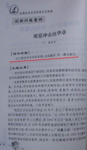 該書主編“唐治云”在引言部分提到,這是學(xué)校的一項(xiàng)“創(chuàng)新訓(xùn)練案例”,寫作命題是“以人體藝術(shù)為寫作范圍,自擬題目,寫一篇記敘文”,以“視覺沖擊出華章”。