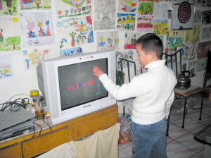 記者日前一進(jìn)小信信家,就被客廳四周貼滿了的畫吸引住了:有飄著鮮艷的五星紅旗的遠(yuǎn)洋艦;有活潑可愛的兩只大熊貓;有遨游在大海的快樂魚兒。一臺(tái)電視機(jī)正在播放股市行情的節(jié)目,小信信則聚精會(huì)神地觀看著,并很專業(yè)地向記者講解與分析(見圖)。