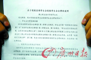 記者調(diào)查了解到,佛山職業(yè)技術(shù)學(xué)院是佛山的一所大專院校,共有十幾個專業(yè),三年制,全校共有3000多名學(xué)生。從2007年年底,該學(xué)院的學(xué)生會要求全校學(xué)生交納學(xué)生會會費,開始時是每年交一次,一次交20 元,后來改成一次性交齊60元。三個年級三年下來收費將達(dá)18萬元。