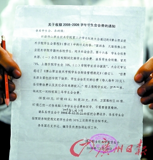 記者從該學(xué)校學(xué)生會2008年12月15日下發(fā)的一份蓋有公章的《關(guān)于收取2008~2009學(xué)年學(xué)生會會費的通知》上看到,收取會費的根據(jù)是佛山職業(yè)技術(shù)學(xué)院第三次學(xué)生代表大會通過的《佛山職業(yè)技術(shù)學(xué)院學(xué)生會章程》(修改)中的有關(guān)內(nèi)容,“凡取得佛山職業(yè)技術(shù)學(xué)院學(xué)籍的在校學(xué)生,均為本會會員”、“學(xué)生會經(jīng)費來源,會員在校期間交納學(xué)生會會費(每人每年20 元),由系學(xué)生會收繳,留用70%,上繳學(xué)院學(xué)生會30%!