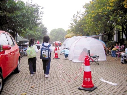 昨晚,記者來到祈福新村學(xué)校門口,昏黃的燈光下,疲憊不堪的家長們坐在躺椅上閑聊,有的干脆鉆到自帶的蒙古包帳篷里睡覺。現(xiàn)場到處彌漫蚊香和驅(qū)蚊水味道。
