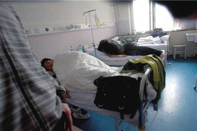 昨天下午1點,在北京市第六醫(yī)院南樓住院部4層,中央戲劇學(xué)院的患者分散在3個病房,有近20人。他們打著點滴,躺在病床上,有同學(xué)看護,學(xué)校老師也不斷查看。醫(yī)院西樓還有部分中戲患者,3人在重癥監(jiān)護室。一患病男生說,他事發(fā)前一天曾吃過學(xué)校食堂的三明治。另據(jù)前來探病的女同學(xué)說:“幾乎吃了三明治的同學(xué)都被送到了醫(yī)院診治!