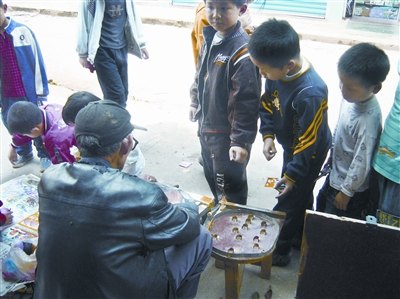 昨日12時20分,正是學校放學的時候,記者現(xiàn)場看到,門口一家文具店里赫然擺著抽獎機。許多孩子圍在一起,他們買來卡片按卡面印刷的獎品現(xiàn)開現(xiàn)兌。校門口左邊,還有一個老人擺著彈珠子的小賭博機;右邊,一個婦女擺抽獎攤,同樣吸引了不少學生(見圖)。
