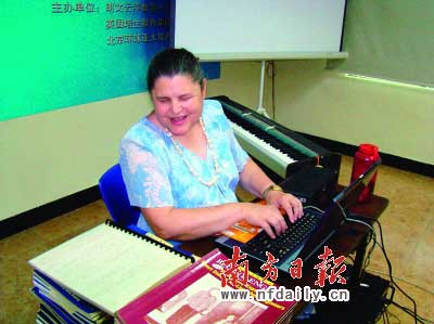 前日,在云浮市區(qū)的唯特教育培訓(xùn)中心,凱文老師時(shí)而在盲人電腦上敲著英語(yǔ)單詞,時(shí)而站起來(lái)向?qū)W生提問(wèn)。她還一邊彈電子琴,一邊教學(xué)生唱英文歌(見(jiàn)圖)。