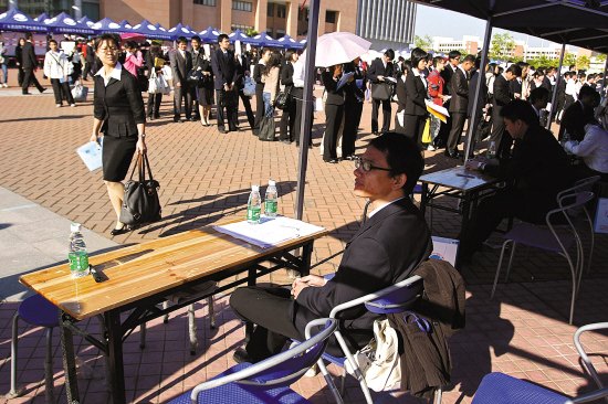 本報訊 記者夏楊、陳輝報道:廣東省2009年畢業(yè)生招聘會第九場本科生、?粕鷮鲎蛉赵诖髮W城廣東外語外貿大學舉行,共有150個企業(yè)攜2500 多個崗位前來攬才,吸引了1.5萬余名畢業(yè)生。盡管說是本科生、?粕鷮,但招聘單位招收的多是本科或以上學歷。一些企業(yè)甚至標明只要研究生,?粕軈⑴c競爭的崗位少之又少。