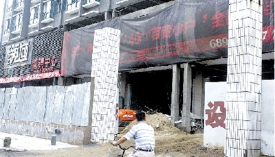 走進(jìn)大樓內(nèi),施工聲不絕于耳,通道兩側(cè)堆滿建筑材料,墻體上的鋼架結(jié)構(gòu)沒有拆除。