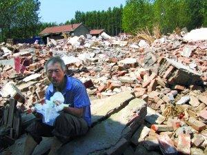 9月15日,山東諸城枳溝二村,一名農民在瓦礫上吃午飯。他當天在整理建筑垃圾,尋找可用的材料。本報記者 涂重航 攝