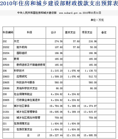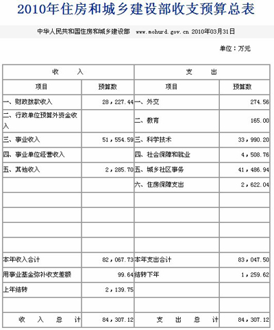 中新網(wǎng)3月31日電 住房和城鄉(xiāng)建設(shè)部網(wǎng)站今日發(fā)布住房和城鄉(xiāng)建設(shè)部部2010年部門預(yù)算表,其中包括2010年收支預(yù)算總表以及2010年財政撥款支出預(yù)算表。這是繼國土資源部及財政部公開部門預(yù)算后,第三個公開預(yù)算的中央部委。