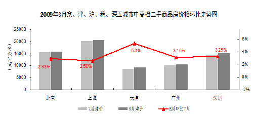 從圖表中的數(shù)據(jù)可以看出,2009年8月京、津、滬、穗、深五大城市的中高檔二手房價(jià)格均呈上漲走勢。在上述五大城市中,8月份中高檔二手房上海和北京分別上漲2.58%和2.93%?傮w來看,2009年8月五大城市中高檔二手商品房在市場成交活躍的促進(jìn)作用下,價(jià)格再創(chuàng)新高。價(jià)格上漲最明顯的依然是天津,上漲了5.3%。其次是深圳和廣州,分別上漲3.25%和3.15%。