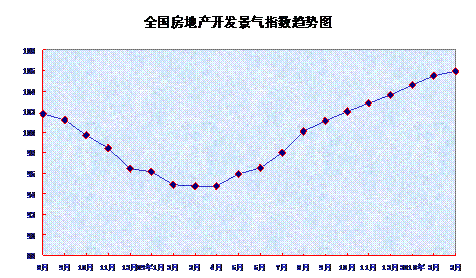 從分類指數(shù)看:房地產(chǎn)開發(fā)投資分類指數(shù)為103.58,比2月份提高1.76點,比去年同期提高11.58點;本年資金來源分類指數(shù)為119.67,比2月份持平,比去年同期提高25.96點;土地開發(fā)面積分類指數(shù)為87.07,比2月份回落1.32點,比去年同期回落5.13點;商品房空置面積分類指數(shù)為99.79,比2月份提高1.80點,比去年同期提高7.76點;房屋施工面積分類指數(shù)為112.04,比2月份提高2.74點,比去年同期提高18.54點。