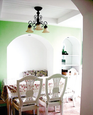 就餐環(huán)境的色彩配置對家人的就餐心理影響很大。孫女士在裝飾餐廳時(shí),選擇淺綠色為主色調(diào),搭配上白色餐桌椅。明朗輕快的色調(diào)不但能增進(jìn)就餐者的興致,刺激食欲,而且能營造一種溫馨、甜蜜的氛圍(如圖②)。