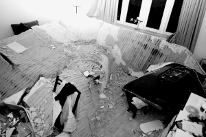 記者在顧小姐家中看到,她的屋子有里外兩間,窗戶臨街的是一間16平方米大的臥室。此時一張“泥網”蓋住了臥室內的大小家具,一臺50英寸的背投彩電被塌下的泥墁砸倒后橫在地上,天花板上只剩下了裸露在外的木條吊頂。