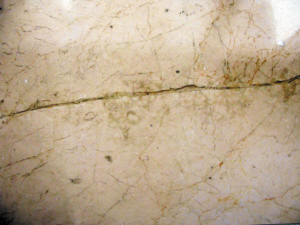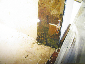 近日,記者來到羅湖寶安南路幸福里樓盤,并隨當事人李小姐前往她在小區(qū)3棟某戶的公寓。剛出電梯,一大堆裝修材料便映入眼簾,而房內也是一片狼藉一片。在公寓內部,堆放著一些拆卸下來的裝修材料及部件,客廳屋頂轉角處依稀有滲水的痕跡,衛(wèi)生間及廚房部分的門框都被拆掉。除此之外,當事人還向記者指點了多處大理石的裂紋。