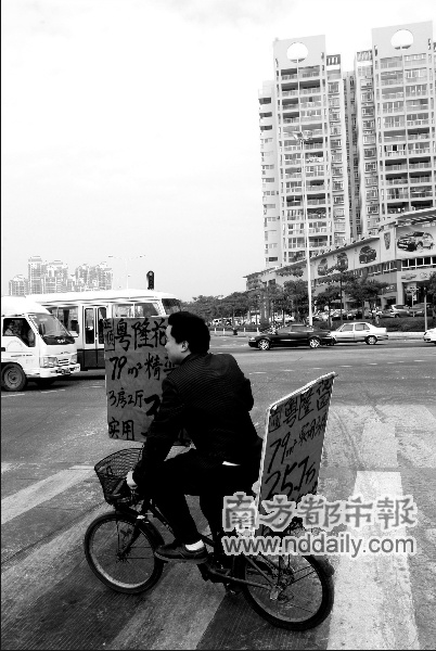 他不是收購(gòu)廢舊家電,而是推銷(xiāo)房子。昨天中午,在珠海香洲區(qū)梅花路三叉路口附近,出現(xiàn)了一個(gè)特別的房屋經(jīng)紀(jì)人:穿西裝,沒(méi)打領(lǐng)帶,騎一輛半舊女式自行車(chē),車(chē)前后各固定一塊大紅紙板,寫(xiě)著他認(rèn)為“最吸引”的二手房源信息。