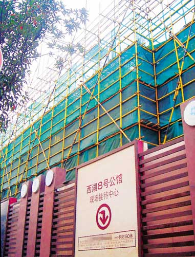 在吳山廣場邊上的四宜路上,記者找到了這個占地僅5980平方米的樓盤。因?yàn)榕R近西湖,有限高規(guī)定,所以在一片二手房簇?fù)碇械奈骱?號公館并不是那么顯眼。整個樓盤僅有兩幢房子,而且中間還隔著一幢破舊的樓房,看起來,樓盤的小景觀并不是特別理想。