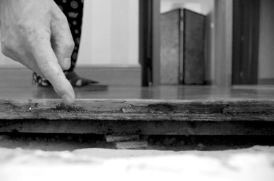 “距我們反映主衛(wèi)門框下面滲水、造成主臥的地板部分褪色、門框底框腐爛、門套底部貼面有氣泡突起、地磚大面積發(fā)黃這些問題已經(jīng)一個月了。有人來看過也說是‘防水沒做好’,但沒單位負起這個責,徹底解決這件事,只是互相推諉。作為弱勢群體的我們只能不停地反映、等待,F(xiàn)在被挖開的地方,每天都會有小蟲爬出來。哎,花600多萬買的房子,浴缸卻只能看不能用。 ”陳老先生的老伴邊說邊指著旁邊畚箕里她掃出來的黑色小蟲子。對此,物業(yè)部門也派人檢查了好幾次。