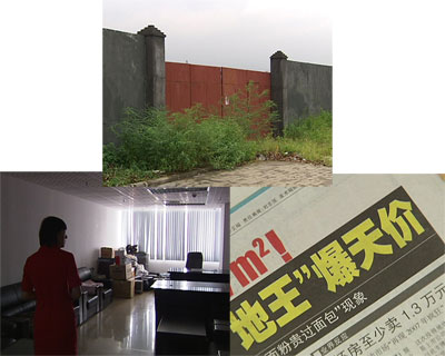 2007年9月11日,保利地產(chǎn)在一天之內(nèi)以8769和8112的高昂價(jià)格,拿下了這里的兩塊土地,成為地王。現(xiàn)在土地已經(jīng)被鐵皮墻包圍起來(lái)。大門(mén)門(mén)口雜草叢生,看起來(lái)很少有人光顧。我們找到了看守工地的施工人員。
