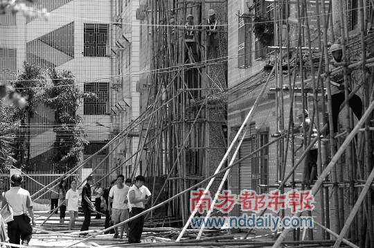 昨日記者在現(xiàn)場(chǎng)了解到,橫崗街道執(zhí)法隊(duì)將拆除這些違建的腳手架和升降機(jī)等工具。