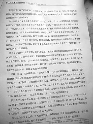 昨日,重慶一網(wǎng)友自稱貼出隆鑫地產(chǎn)一份高層內(nèi)部南山會(huì)議講話稿的照片,其稱在春節(jié)后,隆鑫地產(chǎn)欲對旗下樓盤降價(jià),以期快速回籠資金去買地?cái)U(kuò)張規(guī)模。從內(nèi)容上看,講話者像是為隆鑫降價(jià)做動(dòng)員工作,表明降價(jià)的目的是快速回籠資金并擴(kuò)大規(guī)模。網(wǎng)友在跟帖中稱,萬科松山湖會(huì)議紀(jì)要事件驚現(xiàn)重慶版,隆鑫降價(jià)講話遭網(wǎng)絡(luò)泄密。隆鑫地產(chǎn)一位不愿意透露姓名的高層告訴記者,內(nèi)部正在追查泄密者。