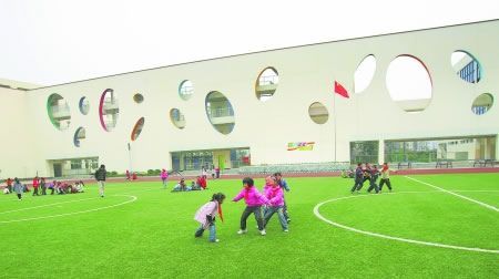 昨日下午,記者來到草堂小學(xué)翠微校區(qū),4棟通過走廊連為一體的4~5層的建筑格外引人注目。正對(duì)學(xué)校大門的墻體,鑲著10多個(gè)彩色的橢圓。設(shè)計(jì)者、西南交通大學(xué)教授王蔚介紹說,翠微校區(qū)占地20余畝,建筑面積一萬余平方米,而總投資僅2000多萬元!斑@些彩色的橢圓圖案,代表著水滴。陽光下,‘水滴’呈現(xiàn)出不同顏色,這代表了學(xué)生們的不同個(gè)性。校舍以‘陽光下的水滴’為設(shè)計(jì)構(gòu)思,充分表達(dá)了在我國素質(zhì)教育的原則下,尊重個(gè)性發(fā)展,尊重少年兒童人格特征的理念!