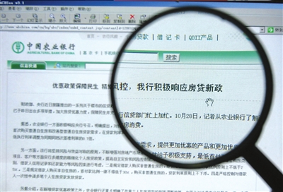 昨天下午,農(nóng)行成為本輪新政出臺(tái)后首家發(fā)布房貸細(xì)則的銀行,但在當(dāng)天晚上,農(nóng)行市場(chǎng)部卻通知記者:“該細(xì)則有些細(xì)節(jié)還要改動(dòng),監(jiān)管部門已將掛在農(nóng)行首頁(yè)上的相關(guān)文章撤下!庇浾唠S后打電話咨詢銀監(jiān)會(huì)相關(guān)負(fù)責(zé)人,該負(fù)責(zé)人表示沒(méi)有下達(dá)過(guò)指令,不清楚是什么情況。有業(yè)內(nèi)人士坦言,新政策“很難把握”,還得再看看。