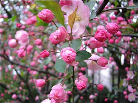 海棠:海棠花姿瀟灑,雅俗共賞,素有“花中神仙”“花貴妃”之稱。明代《群芳譜》記載,海棠有四品,指的是西府海棠、垂絲海棠、木瓜海棠和貼梗海棠。植物園內(nèi)這幾種海棠都有種植,目前已大量開(kāi)放,有粉紅、鮮紅、粉白等多種花色。