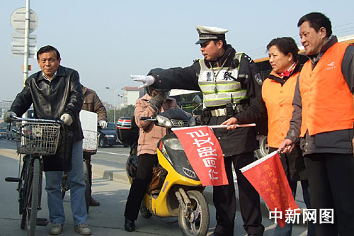 日前,在浦東盧浦大橋下的第一個(gè)叉路口、耀華路西營路路口,世博場館西大門的第一個(gè)交通崗,上鋼社區(qū)交通文明志愿者分別從浦東交警支隊(duì)三大隊(duì)教導(dǎo)員曹德勝和上鋼街道文明辦主任彭薇芬手中接過“爭創(chuàng)示范文明崗”的旗幟后,浦東世博區(qū)域警民攜手共同創(chuàng)建世博交通第一崗正式啟動(dòng)。