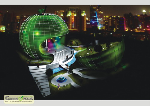 羅馬尼亞國家館的蘋果外形和標志文字“GREENOPOLIS”體現(xiàn)了健康生活方式的重要性、對可持續(xù)發(fā)展理念的關注以及針對現(xiàn)代社會普遍存在問題的以知識為本的解決方案。
