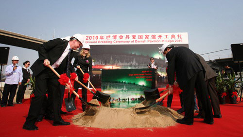 5月15日下午,上海世博會(huì)丹麥國(guó)家館在世博園區(qū)開工建設(shè),丹麥館以“夢(mèng)想城市”命名,將邀請(qǐng)各國(guó)參觀者步入丹麥?zhǔn)降耐捠澜,體驗(yàn)丹麥的城市生活。上海世博會(huì)事務(wù)協(xié)調(diào)局局長(zhǎng)特別助理張?zhí)N杰、丹麥王國(guó)駐上?傤I(lǐng)事何麗蘭(Susanne Hyldelund)和丹麥館項(xiàng)目總監(jiān)韓少江(John Hansen)等出席動(dòng)工儀式。