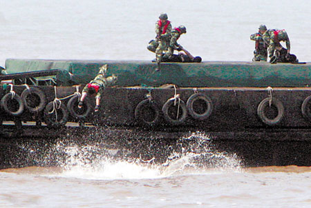 “跳幫!”一聲令下,10余名海警官兵利用兩船靠近和波浪起伏間隙最小的瞬間,飛身魚躍,紛紛越過船艇護(hù)欄,跳到貨輪上。海警擊斃一名“恐怖分子”,制伏兩人,另一名“恐怖分子”慌不擇路跳海,也被飛身入海的海警抓獲。此時(shí)藏匿在機(jī)艙的4名“恐怖分子”瞅準(zhǔn)空隙,駕艇逃竄。