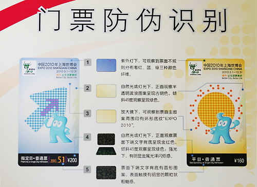 為了讓民眾放心購買,上海世博會門票在防偽方面下足功夫。購票者可通過眼看、手摸、借助紫外燈以及放大鏡等方式判斷門票真?zhèn)!吧虾J啦⿻T票采用了具有自主知識產(chǎn)權(quán)的芯片技術(shù),其最顯著的特點(diǎn)就是將傳統(tǒng)印刷防偽技術(shù)與電子芯片技術(shù)進(jìn)行創(chuàng)新結(jié)合,具有防偽性能強(qiáng)、獨(dú)占性高、唯一性好、時效性長、確保安全可靠等特點(diǎn)!标愊冗M(jìn)介紹說。同時,他表示,有關(guān)部門將嚴(yán)厲打擊非法銷售世博會門票的行為,以保護(hù)廣大購票者利益。 (徐筍)