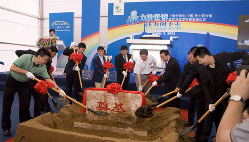 奠基儀式上,阿里巴巴董事局主席馬云代表民企館組委會(huì)與上海世博局局長(zhǎng)洪浩互贈(zèng)禮物。雙方分別贈(zèng)送的是象征中國(guó)精神的上海世博會(huì)中國(guó)館模型和寓意中國(guó)民企“鼎力助世博 活力創(chuàng)未來(lái)”的琉璃鼎。