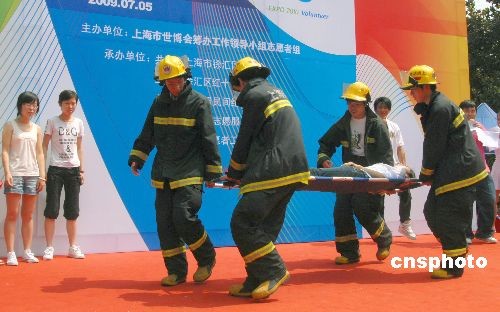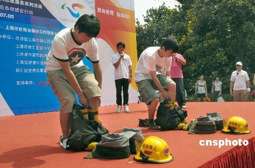 7月5日是中國2010年上海世博會倒計(jì)時(shí)300天,“我們在你身邊”世博會大型志愿者集中服務(wù)行動(dòng)在申城各街道社區(qū)拉開帷幕,世博志愿者在徐家匯公園進(jìn)行模擬心肺復(fù)蘇應(yīng)急救援演示,活動(dòng)現(xiàn)場還有消防中隊(duì)官兵宣講高樓逃生技巧、滅火器操作方法等,旨在普及、宣傳應(yīng)急救援知識,提高公眾的安全意識和應(yīng)變能力,保障世博會游客安全。中新社發(fā) 海牛 攝