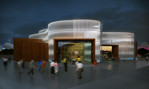 據(jù)智利館的全程服務(wù)商上海美術(shù)設(shè)計(jì)公司副總經(jīng)理王海利介紹,智利館的設(shè)計(jì)理念是一個(gè)呈波浪般起伏的水晶杯,又有大海中航船的意象。在造型復(fù)雜的鋼 結(jié)構(gòu)和玻璃墻之外,覆有特制的鋼絲網(wǎng),加上大面積的屋頂花園,可起到遮陽節(jié)能的作用。